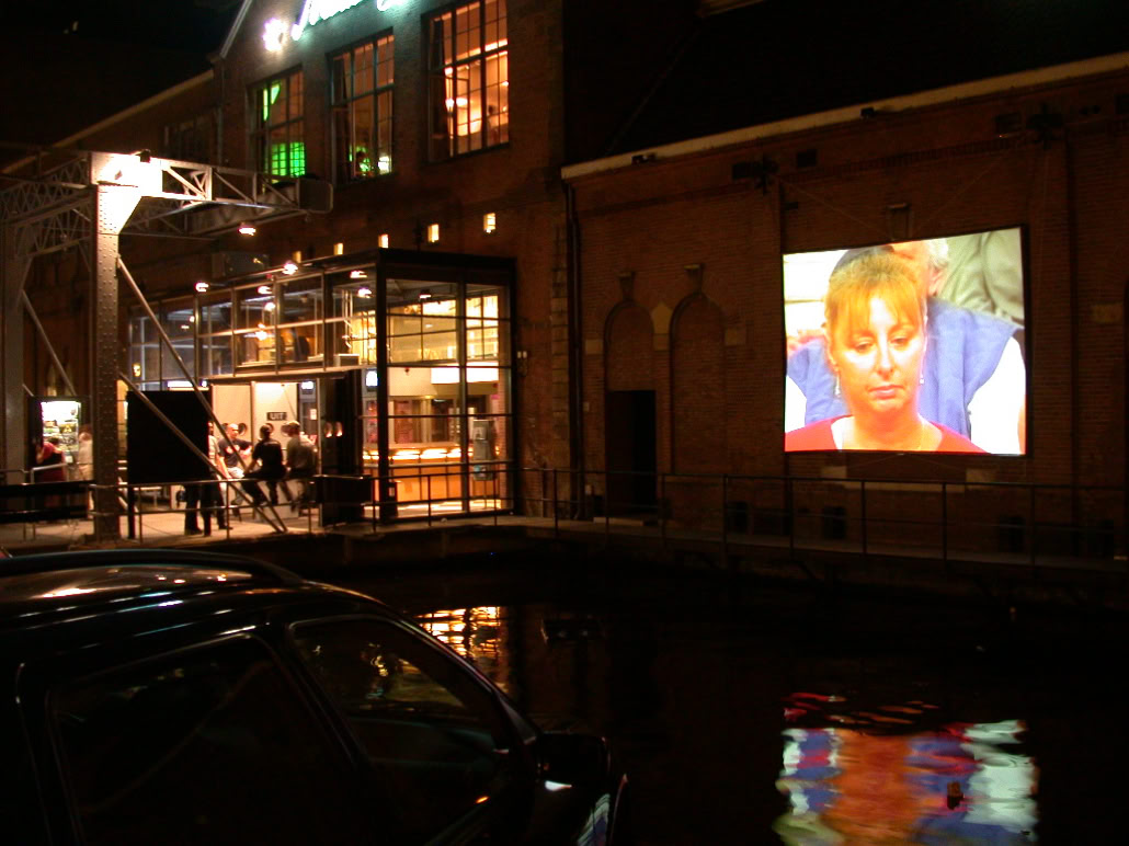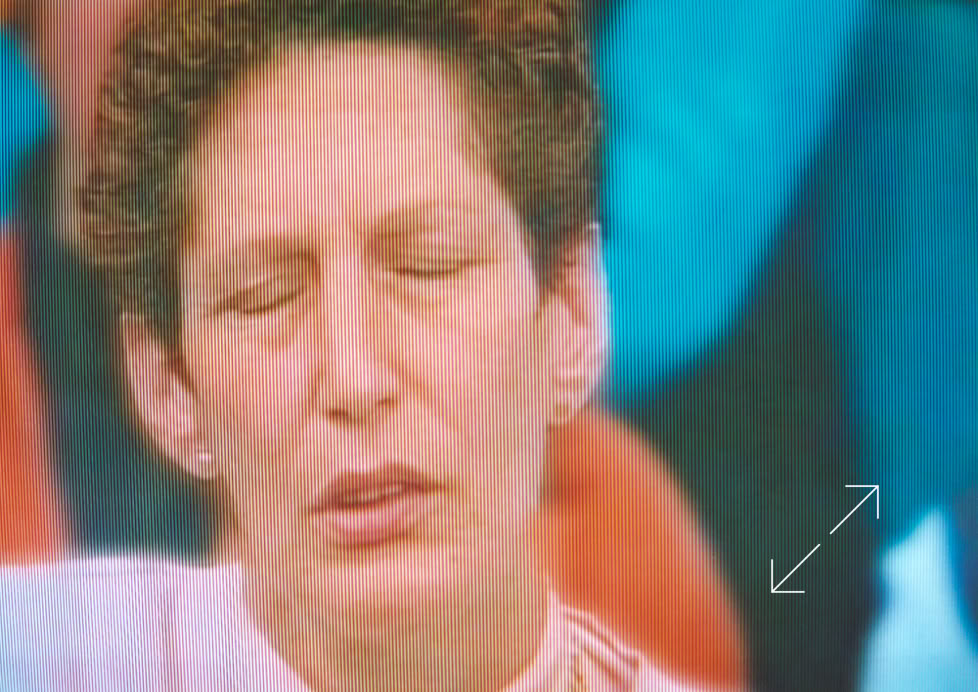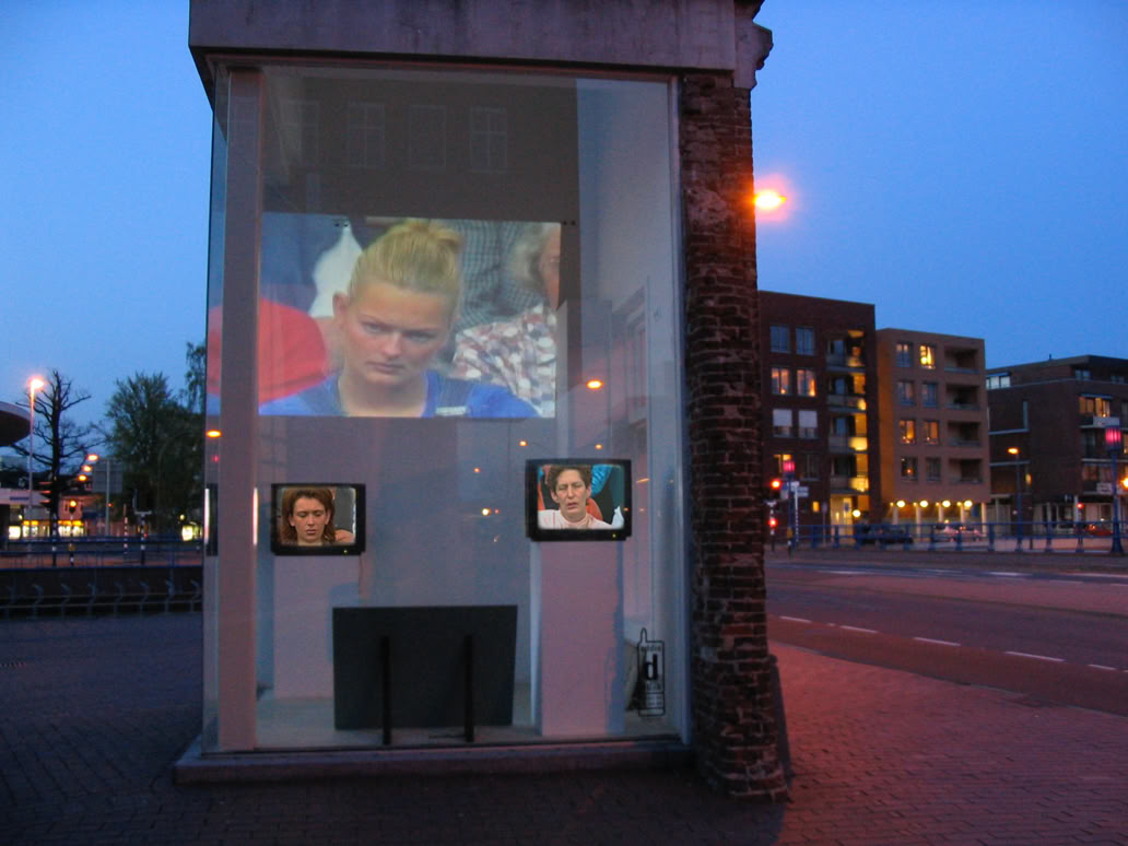 In combination with the video are several photo's, size 1,19 m. x 0,84 m., of some of the characters from the video. The photos are taken from a checkmonitor that produces a line pattern. This pattern creates an extra distance between the viewer and the portrayed.