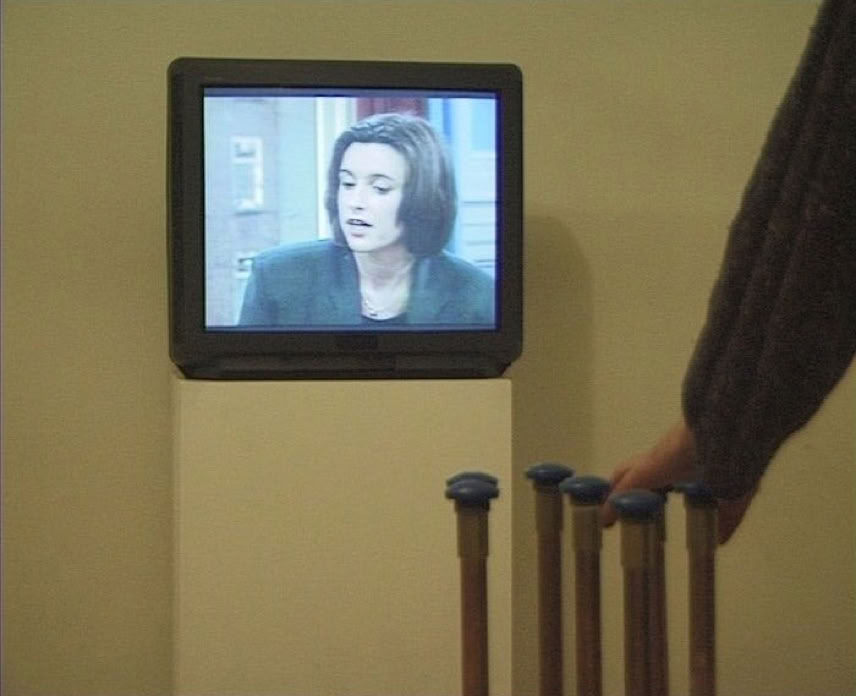 If the viewer presses one of the buttons, on the monitor a persons head comes up and gasps.