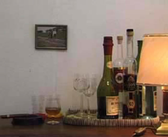 On the right side monitor is a tray with bottles of exquisite liquors, some glasses, an ashtray with a cigar and a glass of brandy. On the wall is a small photo with a group of people, one of them being the artist as a young man.