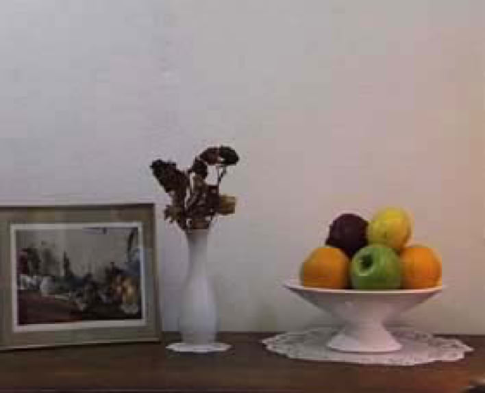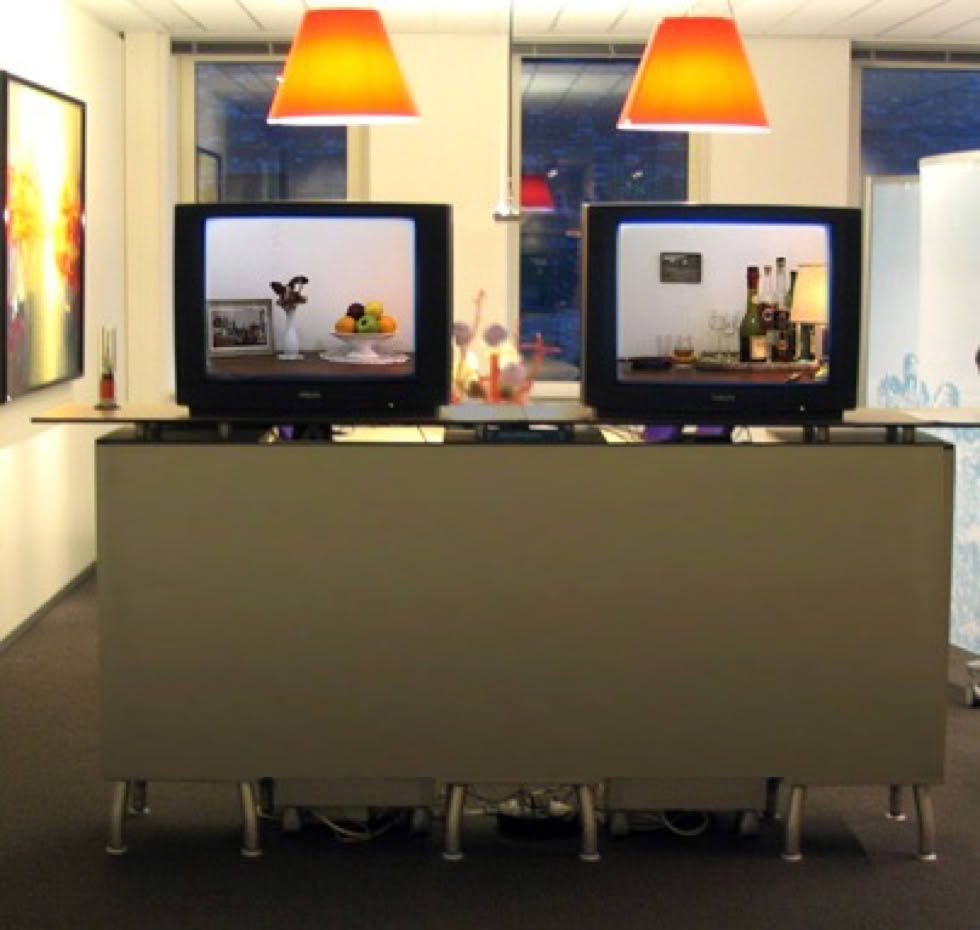 Two pedestals, a few feet apart and about 1,15 m. high, carry a large monitor. They show a two-part still life of a long sideboard.