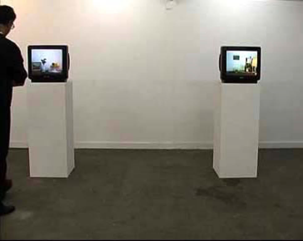 In reaction of specific movements of the viewer suddenly the table-lamp, that was visible in one of the screens, starts to move through the image to the other monitor. It stays there until some action of the viewer makes it move back to the first one.