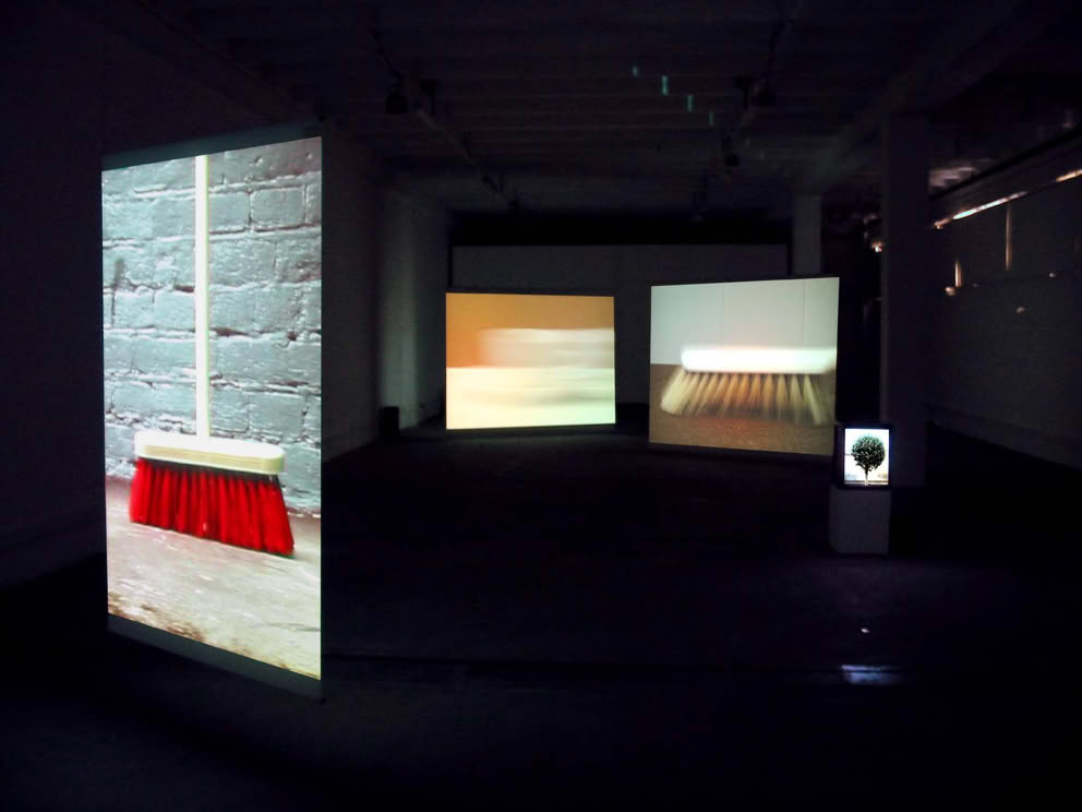 The two main screens are 3,5 m. by 2,6 m. A third screen of 2 m. by 3 m. shows the still-image of a broom. It will not move until it’s action is required within the composition. It is a percussion instrument that, at some point, plays a duel with the brush on one of the other screens.