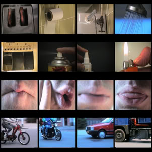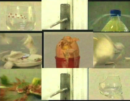 In a virtuoso succession of fragments of images and sound, eddie d. does not show the world of ordinary objects as being inert or passive but as if they are constantly in motion. Hence the sounds that they make when they move, are no longer insignificant noises but have been transformed into rhythmic beats. We hear cutlery clattering in a sink, sandwiches springing from the toaster, a creaking door, spray paint being sprayed... In addition we see and hear actions and sounds that would normally be viewed as being unimportant or banal such as a mouth belching, a throat being cleared, fingers rubbing glass, fingernails scraping across a wall and the stamping of a foot. eddie d. presents illustrative music by editing audio and video tonally. Just like a conventional musical composition, this clip consists of various parts that are defined by the way in which these fragments of image and sound are related to each other.