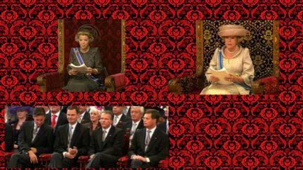 eddie d tackles a special (and extreme) example of political ostentation and ritual in the Netherlands: ‘Prinsjesdag’, the day on which the monarch presents the governmental policies for the forthcoming year tothe collective Dutch parliament. The pompous rituals around this special day are exposed and reduced to their very essence by means of canny editing. 'Majesteit' compares two so-called ‘Throne speeches’ with each other: those of 1997 and 2008. Are there actually any essential differences – apart from Queen Beatrix’s new hat and perhaps the newly designed upholstery on her throne? The government will work hard and cherish hope. The people are expected to behave like good citizens. And all the ministers present diligently join in the ceremonial cheers, but are actually more interested in their own appearance and cuff links.