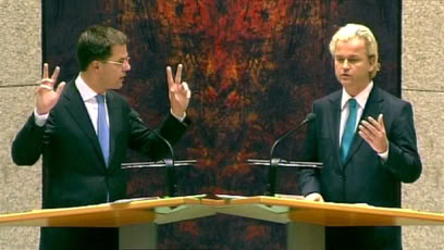 ‘Pas de Deux’ represents a duet or duel in the Dutch House of Representatives: a debate about double nationality, both participants competing for the favour of the right-wing electorate. The opponents are the right-wing liberal politician MarcRutte, regarded as slightly too anxious and leftist by some members of his own party, and the controversial right-wing populist Geert Wilders. The intended discourse and dialogue degenerates into stuttering and stammering, ‘supported’ by a dance of hands that are fruitlessly trying to invigorate the meaningless words. In an audiovisual act, eddie d pushes this grotesque spectacle to an extreme.